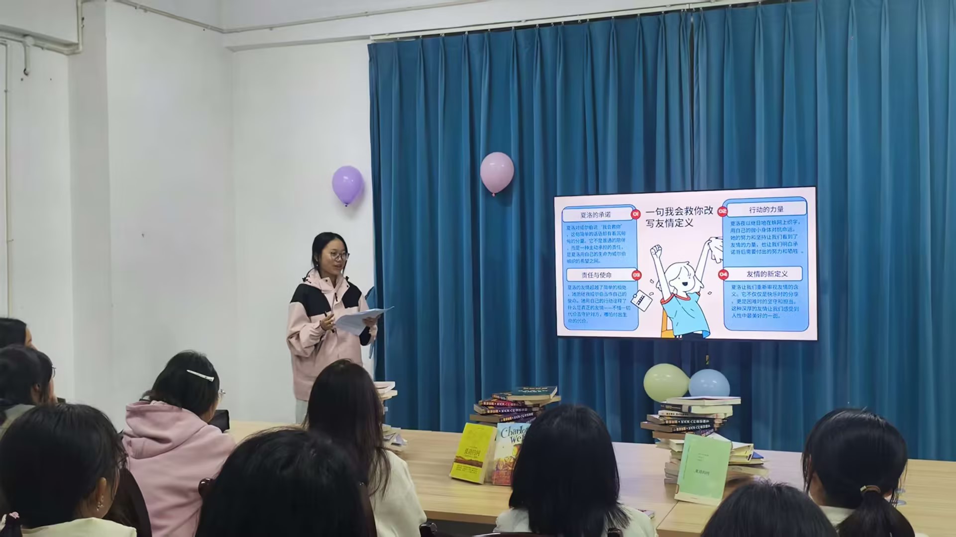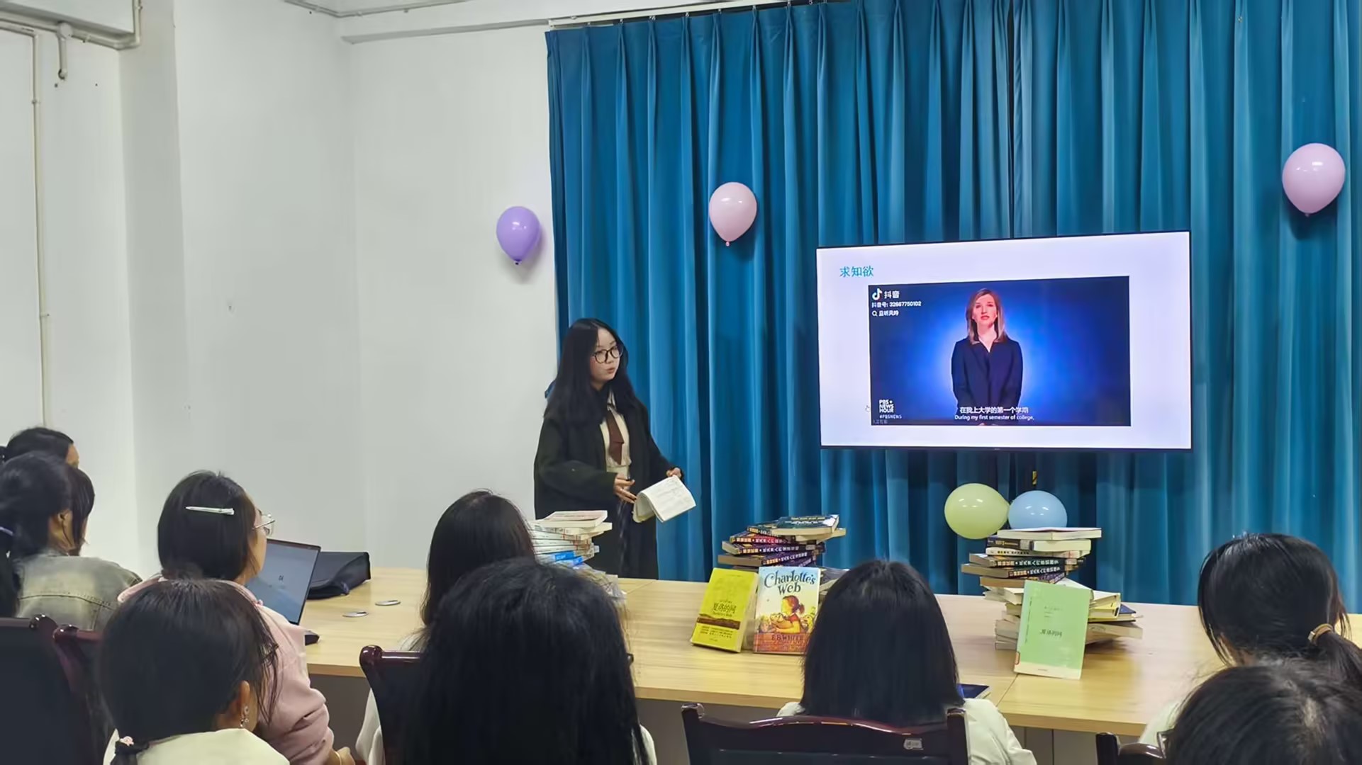 2025级英语3班的刘佳茗同学则以“夏洛的网:在英文原版里打捞友情的重量”为题,分享了沉浸于英文原版阅读的独特体验。她讲述了如何透过文字深刻体悟友情的真挚力量,并通过中英文表达的精妙对比,揭示了原版语言在情感传递上的独特分量。刘佳茗还现场发出倡议,鼓励大家勇于开启英文原版书籍的阅读之旅,在跨语言的文化语境中,更深切地感受文学魅力,同步提升语言素养。