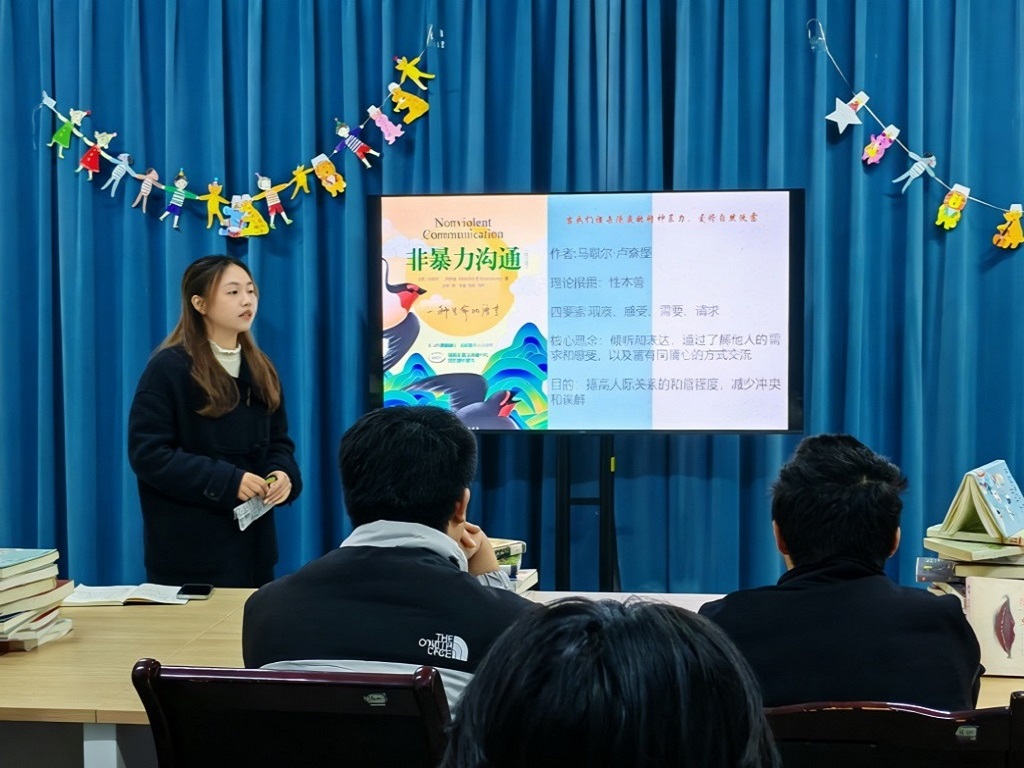 在书香中碰撞思想,于分享中启迪心灵。2025年12月10日晚,图书馆在四楼智汇坊成功举办第四期“阅路同行”主题阅读分享会。本次活动由图书馆学生馆员陈鑫雨同学主持。三位同学从沟通艺术、自我认同与性别批判三个维度进行分享,带领在场同学展开了一场兼具思想深度与人文温度的心灵对话。
