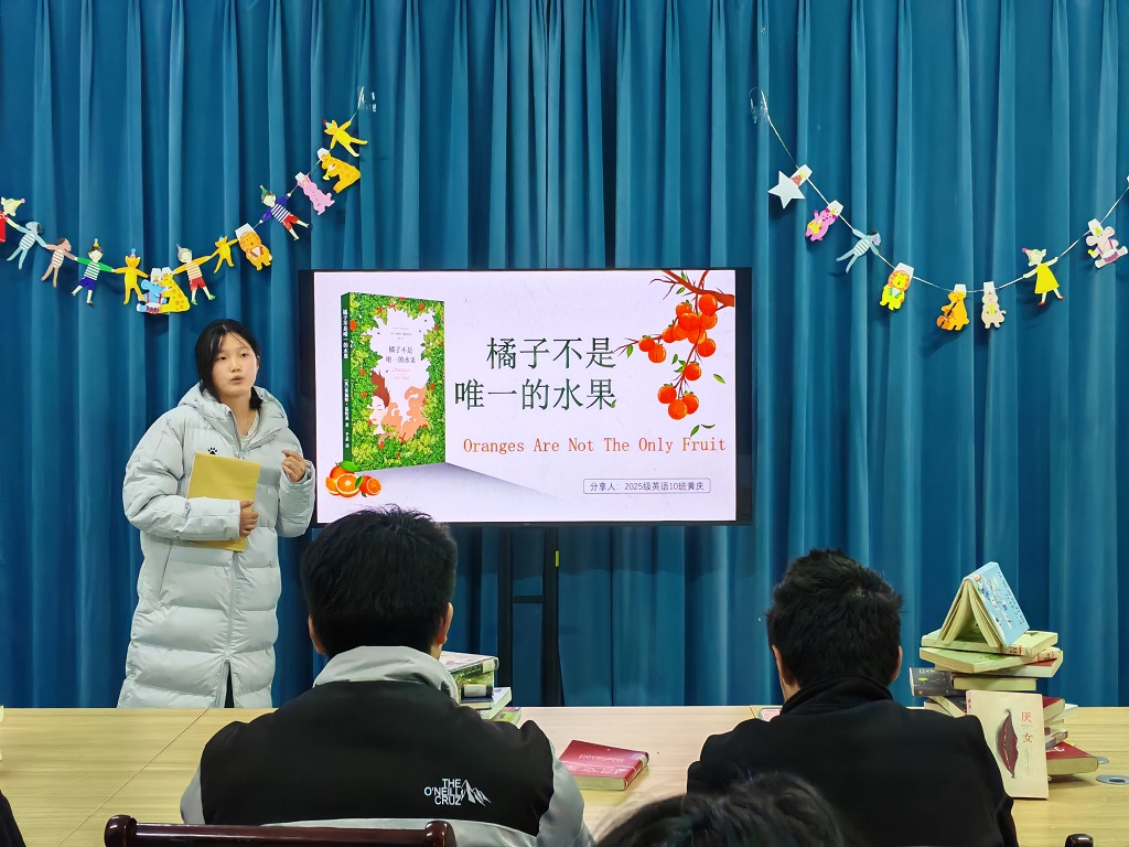 2025级英语10班黄庆同学以《橘子不是唯一的水果》为题,分享了珍妮特·温特森的半自传体小说。她以“人生不只有一种选择”为主线,讲述了主人公珍妮特在宗教与家庭的双重期待中,如何勇敢追寻自我认同与真爱的成长历程。黄庆解析了“橘子”作为单一生活隐喻的象征意义,指出人生的答案从来不是非此即彼,并鼓励大家接纳自我的多样性,在看似既定的人生轨迹中,主动寻找属于自己的“其他水果”。